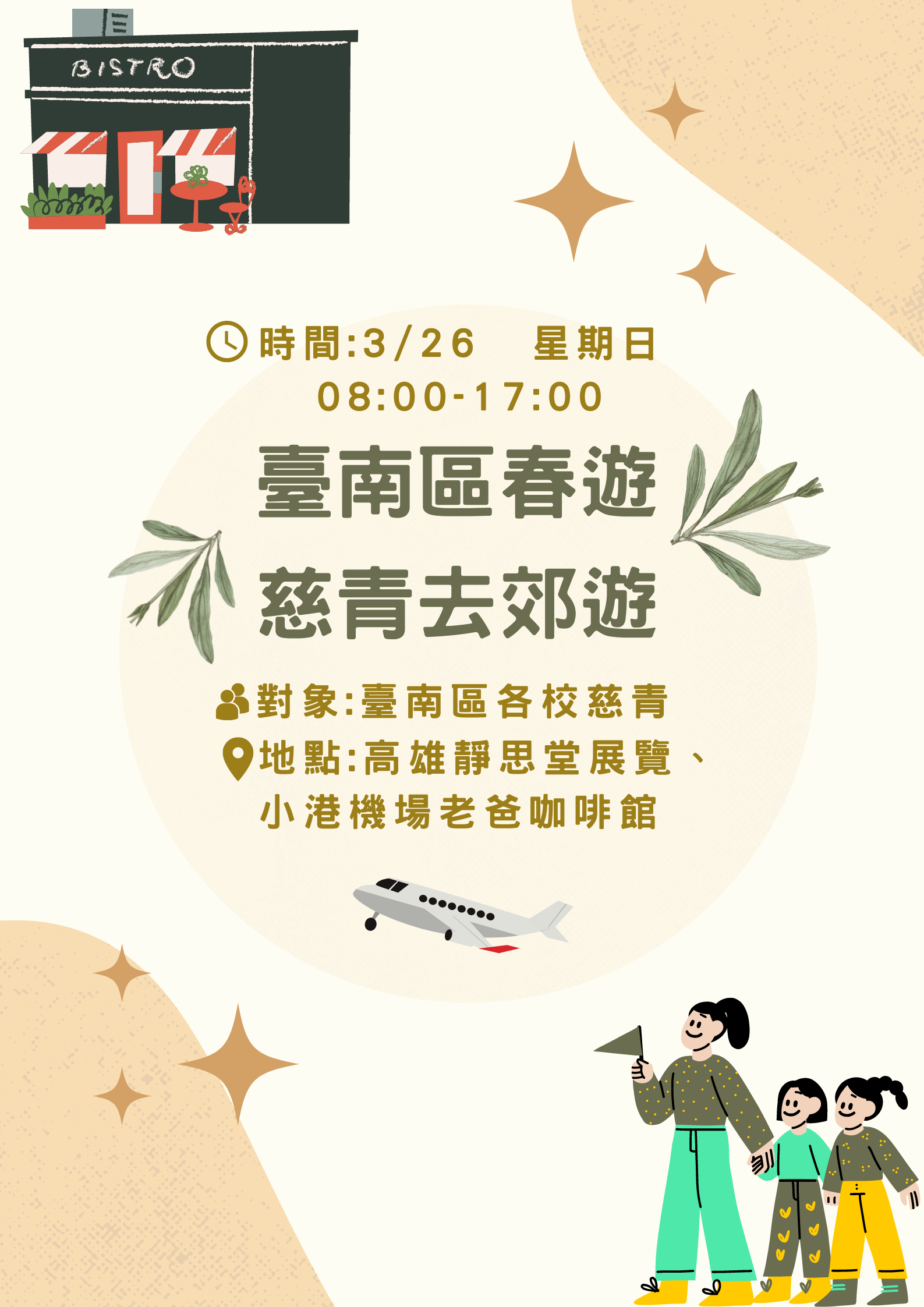 疫情解封已有一段時間,你是否感到忙碌的生活讓你一直無法好好出門走走?學業、工作、感情等各種事務占據了你全部的時間和精力,讓你失去了呼吸新鮮空氣和踏上新旅程的勇氣嗎?別擔心,慈青學長姊正好有一個好消息要告訴你:「臺南區春遊,慈青去郊遊」活動即將舉行,讓我們一起來放鬆、享受、認識新朋友吧!這次的活動旨在讓大家在聚集的過程中放鬆自己、享受生活,同時也可以認識不同學校的夥伴,成為日後社團經營以及招生帶動中最堅強、厚實的靠山與依靠。我們期待通過這次的活動,帶給大家真誠的互動、免費的午餐、溫暖的接送、久違的放鬆和充實的補班週末。