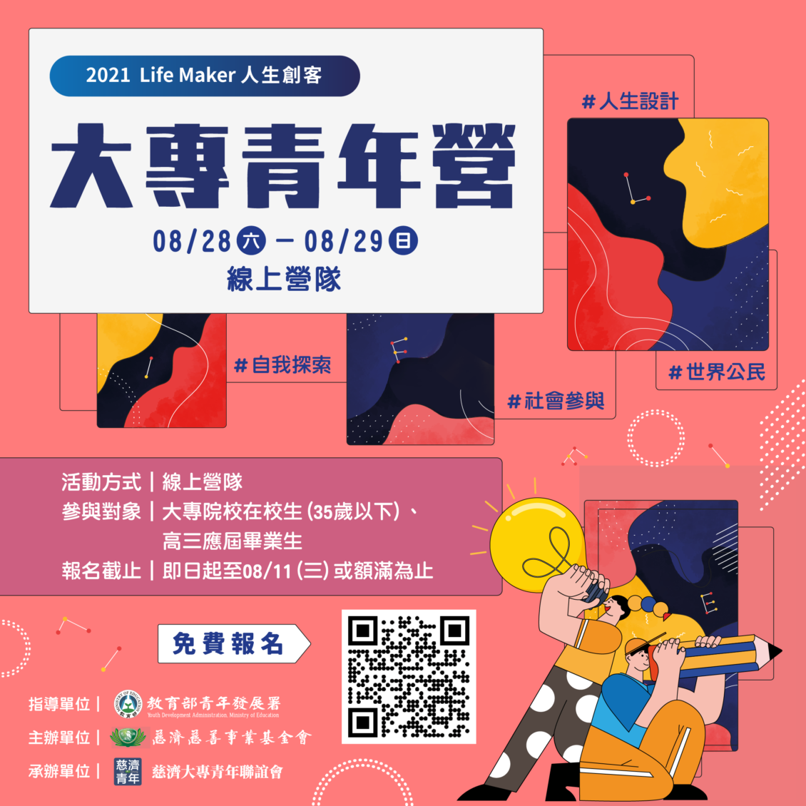 2021年Life Maker人生創客-大專青年營將於8月在臺北及高雄熱情登場!身為世界公民的一份子,你想讓自己成為怎樣的角色?透過參與一場不一樣的人生思維營隊,和各界達人所設計的四大學習主題,從人生設計思考、自我探索、社會參與、到世界公民!可以和各路夥伴們一同洞察自我,覺察自己人生方向,啟發自我,更跳脫框架,創造有影響力的人生,做一個獨一無二的Life Maker!