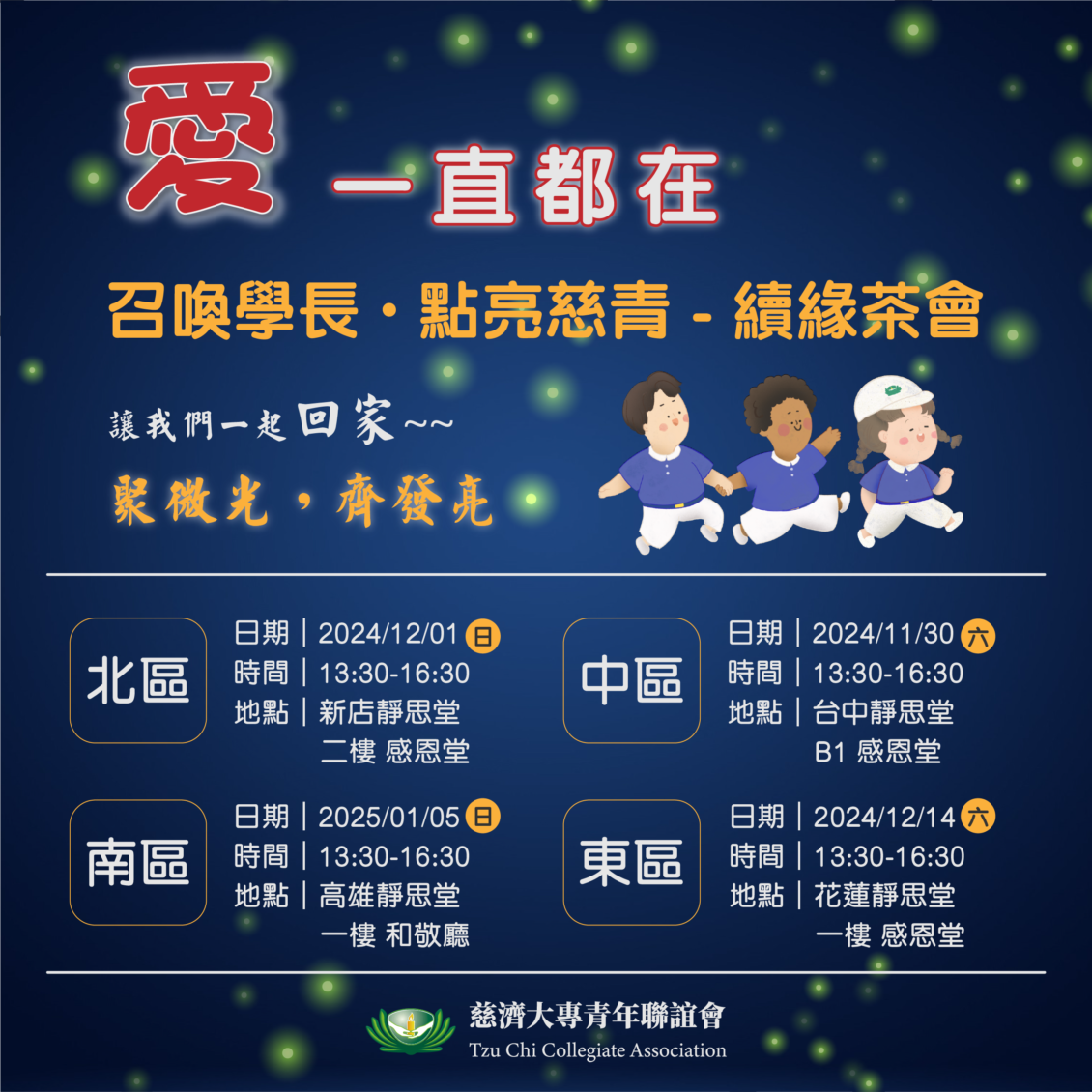 · 中區:2024/11/30(六),1400-1630,台中靜思堂B1-感恩堂